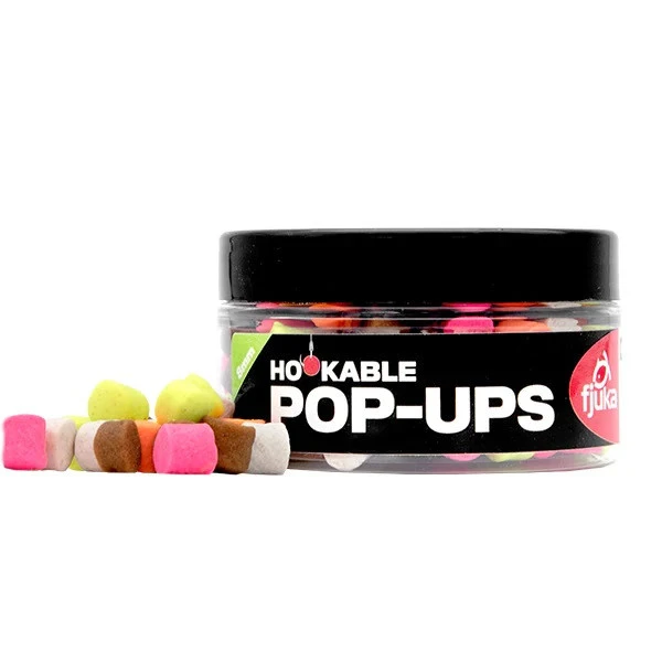 De Fjuka Hookable Pop-Ups zijn te gebruiken direct aan de haak, aan de hair-rig of met de baitband. De popups zijn kleiner te maken door ze simpelweg doormidden te breken. Deze fjuka pop-ups zijn kleine-vis-vriedenlijk gemaakt zodat je niet constant hoeft aan te slaan bij de meest kleine beet. De pop-ups zijn zeer goed drijvend, ook als je deze gebruikt direct aan de haak. De enorm attractieve Sensate toevoeging zorgt in de moeilijkste situaties voor vis. De potjes zijn mixed colour en bevattend de volgende vijf kleuren. Roze, oranje, wit, geel en neutraal. Zo heb je altijd de juiste kleur klaar om aan de haak te doen. Perfect voor de method feeder visserij.